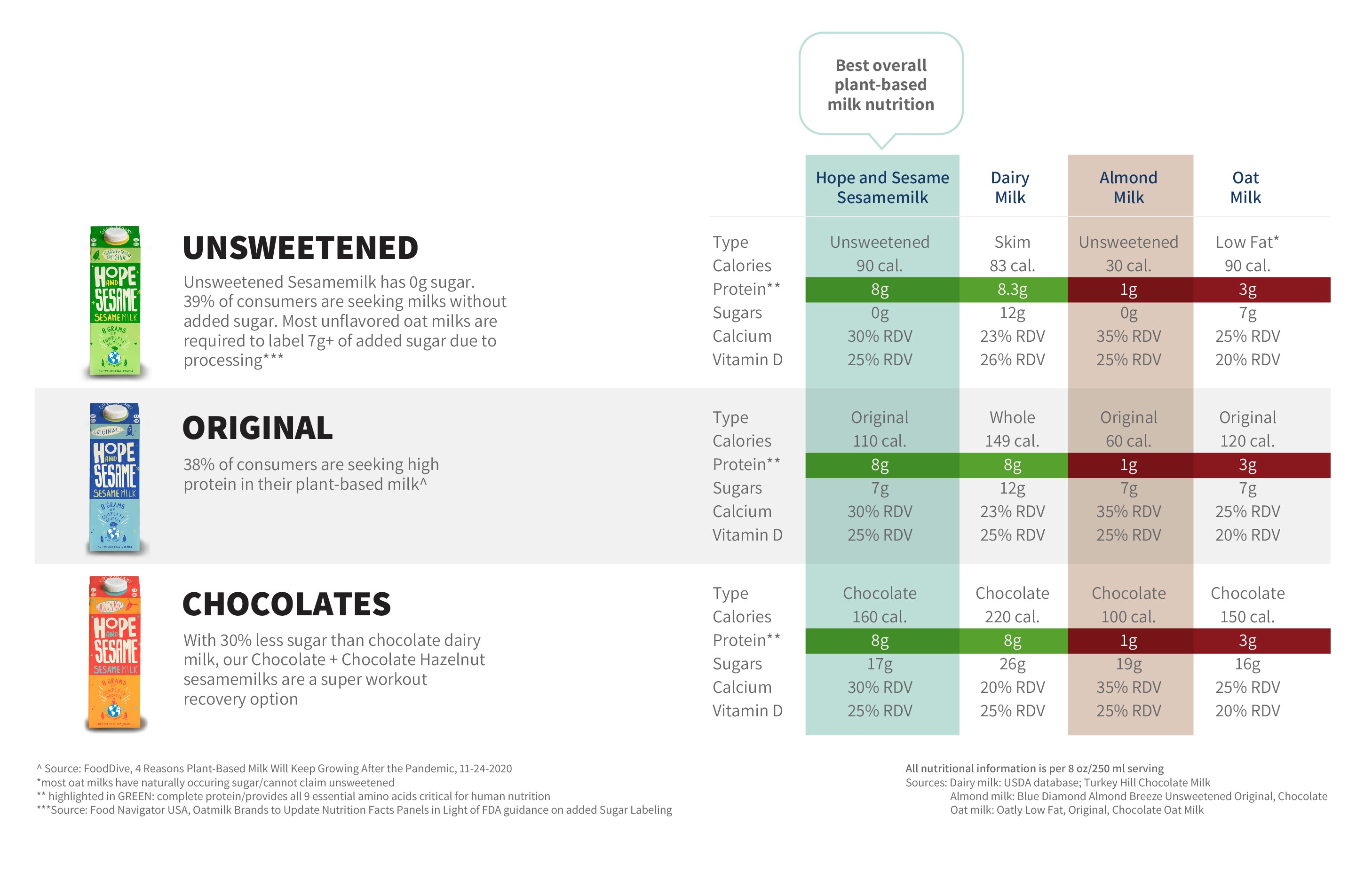 • Each serving of our regular sesamemilks* contain all 9 essential amino acids, 8g of complete plant-based protein is an excellent source of Calcium and Vitamin D.